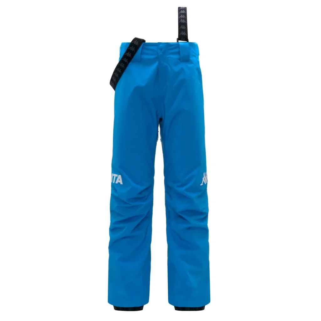 Bretelle staccabili personalizzate Banda con ripetizione del logo Omini, regolazione vita, tasche con chiusure zip impermeabili, rinforzi fondo gamba, apertura zip fondo gamba, zip ventilazione, ghette scarponi, cuciture termonastrate.